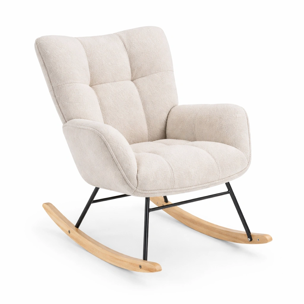 Esta mecedora está tapizada con tela de poliéster, tiene una estructura de acero y una base de madera de haya. Las dimensiones son 97 cm de altura, 72 cm de ancho y 82 cm de profundidad. El color es Beige. El peso neto es de 9.5 kg. Soporta un peso máximo de 120 kg. Para el mantenimiento, limpiar con un paño húmedo y evitar la exposición prolongada al sol.