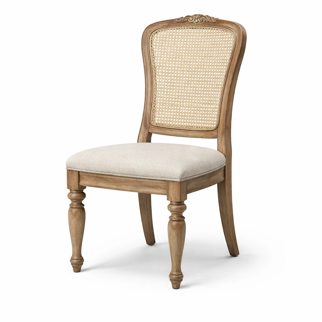 Materiales: Estructura de madera de roble, respaldo de ratán, asiento de lino